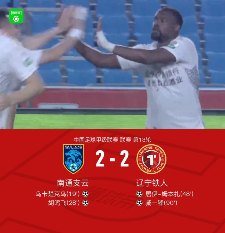 辽宁铁人客场连扳两球2-2南通支云,姆本扎、乌卡楚克乌建功