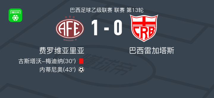北京时间6月22日巴西足球乙级联赛 联赛 第13轮,费罗维亚里亚主场对阵巴西雷加塔斯。费罗维亚里亚内蒂尼奥破门。最终比分费罗维亚里亚 1-0 巴西雷加塔斯。
