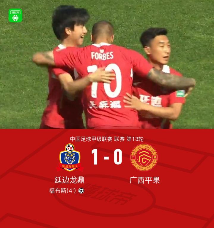 北京时间6月22日中国足球甲级联赛 联赛 第13轮,延边龙鼎主场对阵广西平果。上半场姆巴抢断姚棣然后助攻福布斯闪击。最终比分延边龙鼎 1-0 广西平果。