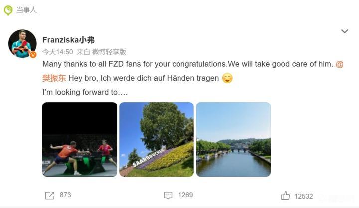 6月22日,德国乒乓球运动员弗朗西斯卡-帕特里克发文称非常感谢所有樊振东的粉丝送来的祝贺,我们会好好照顾他的。