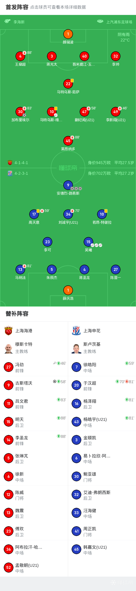 第44分钟,吴曦传中助攻,安德烈-路易斯头球破门,申花1-0领先海港