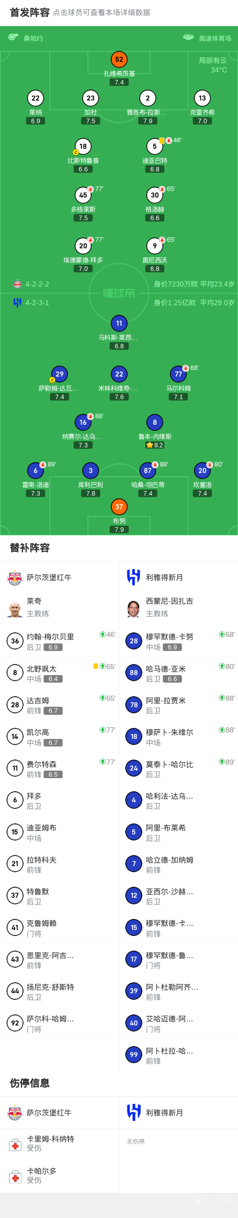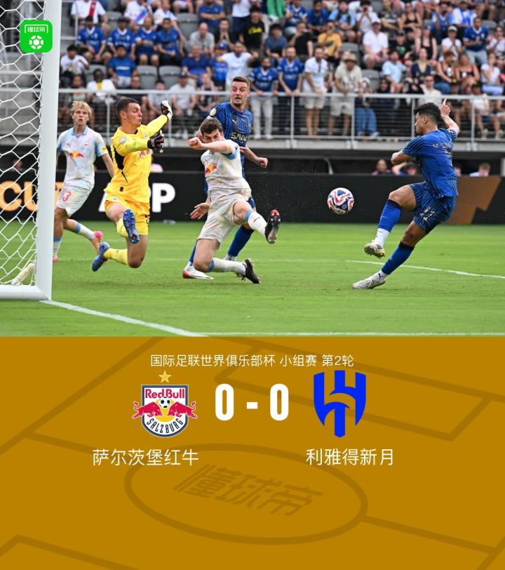 萨尔茨堡红牛0-0利雅得新月,布努发挥稳定,达瓦萨里脚感欠佳战报bot @懂球帝2025-06-23 07:59国际足联世界俱乐部杯小组赛第二轮,萨尔茨堡红牛与利雅得新月展开较量。上半场双方均未能打破僵局,奥尼希沃、莱昂纳多的射门均被化解。下半场,马尔科姆禁区内的推射偏出,费尔特森外围冷射稍稍偏出,随后双方再无建树。最终,萨尔茨堡红牛0-0利雅得新月,双方握手言和。点击查看本场比赛详细数据>>点击查看世俱杯完整积分榜>>球队阵容技术统计展开更多
