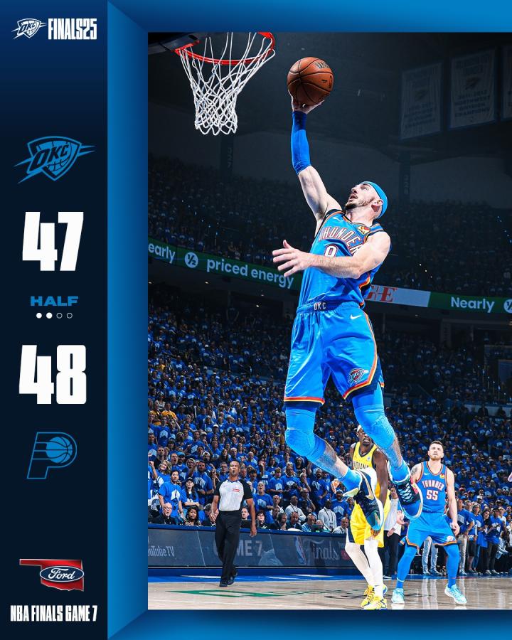 北京时间今日,NBA总决赛G7打响,步行者在客场对阵雷霆,半场战罢,步行者48-47暂时领先于雷霆。