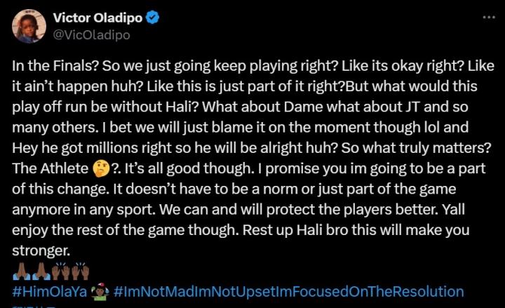 前步行者球员奥拉迪波则呼吁要重视对球员的保护:总决赛?所以我们要继续打下去,对吗?就像没事一样?这只是其中的一件事,但如果没有哈利伯顿,比赛会变得怎么样呢?没有利拉德,没有塔图姆,还有其他很多人。