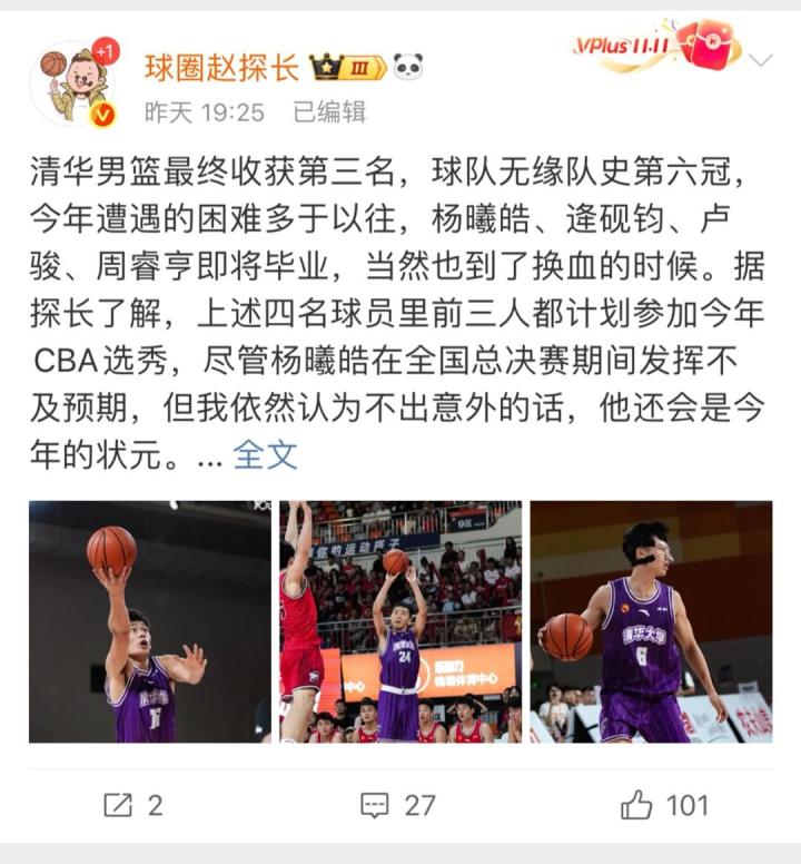北京时间6月22日,CUBAL总决赛、季军战均在杭州落下帷幕。赛后,媒体人“球圈赵探长”更新了社媒,并对清华男篮队员的选秀前景进行了预测。