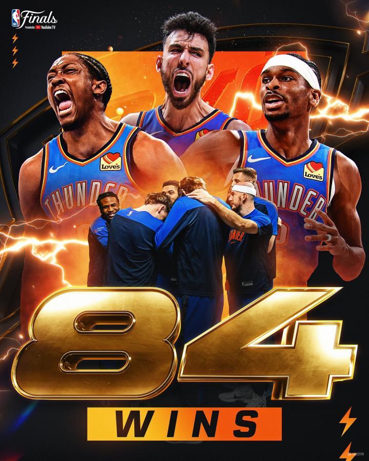 雷霆成为第4支单赛季84+胜场球队,此前仅公牛和勇士做到过
