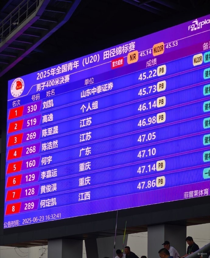 19岁山东小将刘凯45秒22夺男子400米冠军,成为中国现役第一人gaoniu @懂球帝2025-06-23 23:48北京时间6月23日,全国U20锦标赛男子400米决赛,19岁山东小将刘凯以45秒22的成绩夺冠,跃居中国历史第二人,打破全国青年纪录的同时,也成为中国400米现役第一人。原全国青年纪录是新疆选手艾力西尔-吾买尔创于去年亚青赛上的45秒53,这次全国青年锦标赛,艾力没有参加。刘凯的45秒22,距离郭钟泽创于2017年全运会时的全国纪录45秒14,也仅差0.08秒。展开更多