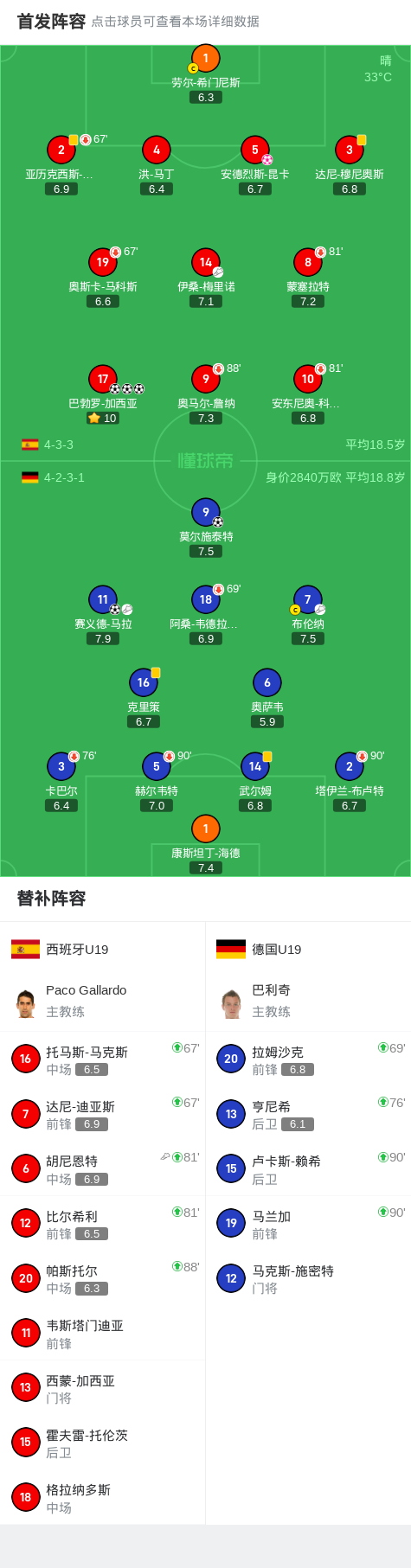 北京时间6月23日欧洲U19青年锦标赛 半决赛,西班牙U19对阵德国U19。西班牙U19巴勃罗-加西亚帽子戏法,安德烈斯-昆卡自摆乌龙。德国U19莫尔施泰特破门,赛义德-马拉破门。最终比分西班牙U19 3-3 德国U19。