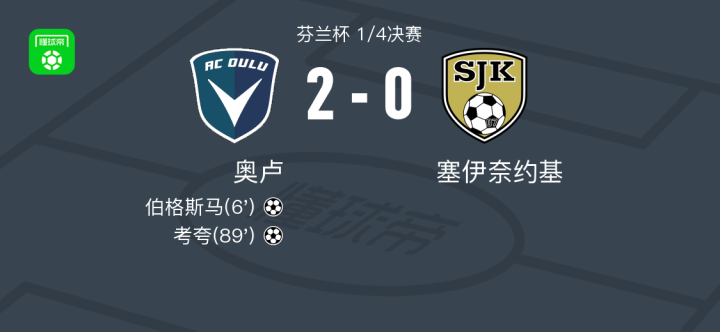 北京时间6月24日,芬兰杯1/4决赛展开较量,奥卢对阵塞伊奈约基。比赛中,奥卢球员约凯宁送出助攻,伯格斯马为球队首开纪录。临近比赛结束时,考夸再下一城,帮助球队扩大比分。最终,奥卢以2-0的比分战胜对手,成功晋级下一轮。