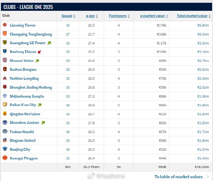 俱乐部总身价方面,辽宁铁人以565万欧元排名第一,重庆铜梁龙以454万欧元排名第二,广东广州豹以352万欧元排名第三,南通支云以318万欧元排名第四。