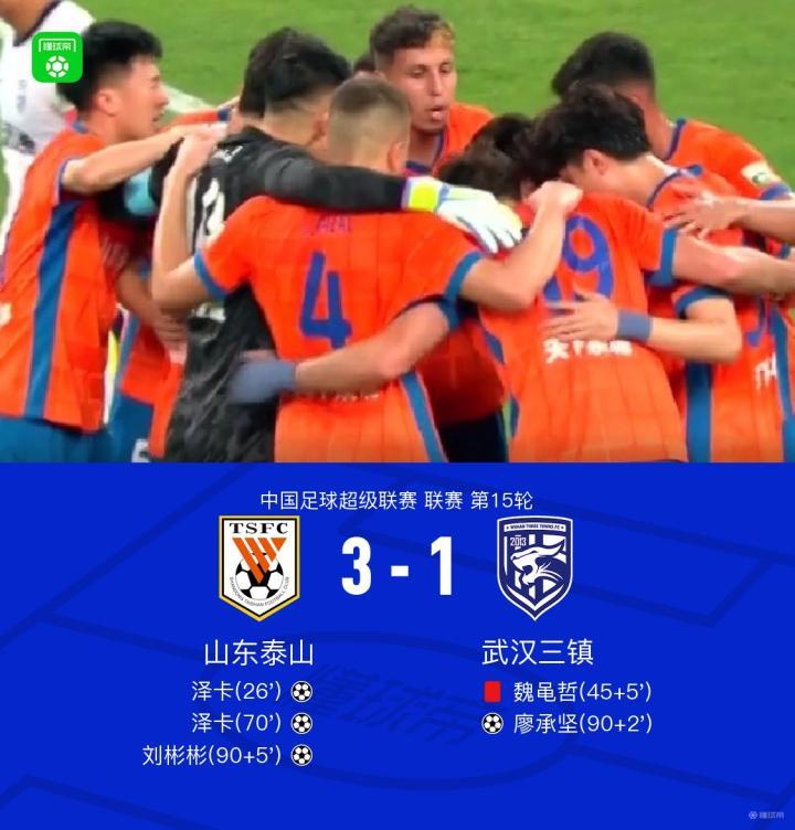 山东泰山坐镇主场迎战武汉三镇的比赛在中超联赛第15轮展开较量。上半场卡扎击中立柱,泽卡头球破门,图多列两中立柱,魏黾哲放倒形成单刀的谢文能染红,下半场泽卡梅开二度+中柱,克雷桑两次击中门框,廖承坚补时扳回一球,随后刘彬彬补射锁定胜局。最终,山东泰山以3比1战胜武汉三镇。