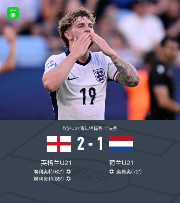 北京时间6月26日,欧洲U21青年锦标赛半决赛展开角逐,英格兰U21与荷兰U21展开激烈对决。比赛中,英格兰U21的埃利奥特表现出色,先后在第62分钟和第85分钟攻入两球,完成梅开二度。荷兰U21方面,奥希奥在第72分钟成功破门,为球队扳回一城。最终,英格兰U21以2比1战胜荷兰U21,晋级下一轮比赛。