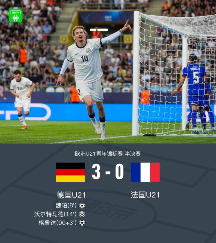 北京时间6月26日,欧洲U21青年锦标赛半决赛展开较量,德国U21对阵法国U21。比赛中,德国U21球员魏珀率先打破僵局,随后沃尔特马德再下一城,进一步扩大领先优势。下半场补时阶段,保罗-万纳送出助攻,格鲁达推射破门,将比分最终定格在3比0。全场比赛结束,德国U21顺利晋级决赛。