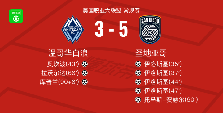 圣地亚哥5-3温哥华白浪取美职联3连胜,伊洛斯基大四喜,托马斯-安赫尔建功