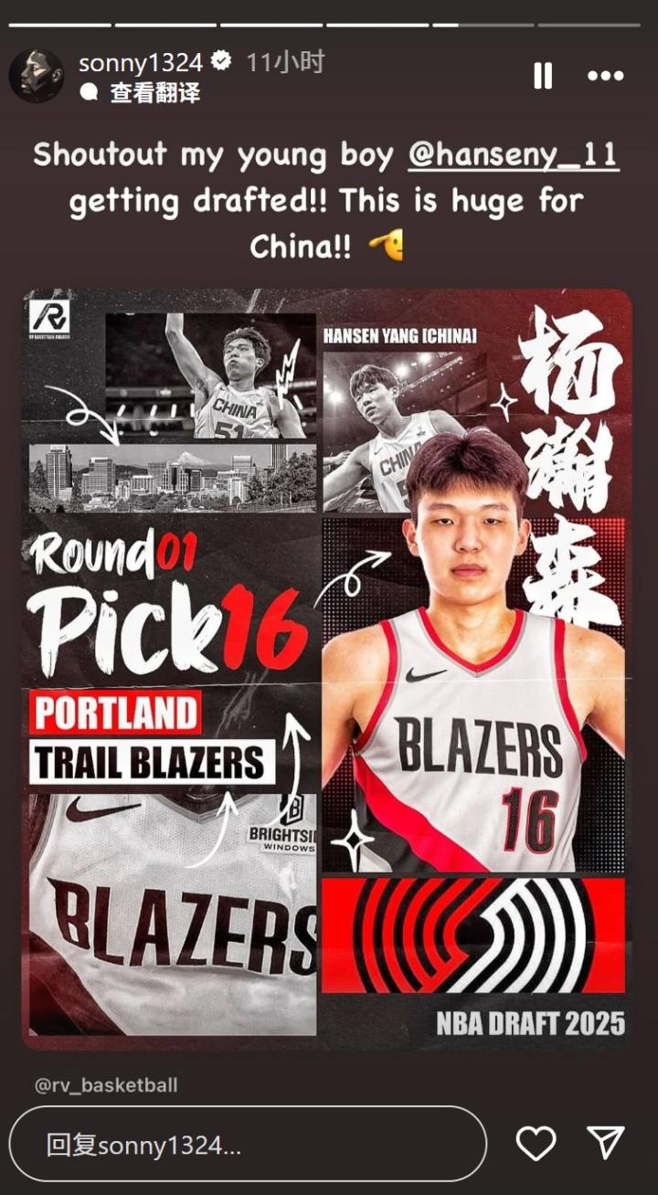 在选秀大会结束后,杨瀚森收到了多方的祝贺。CBA外援威姆斯更新个人社媒,向杨瀚森表示了祝贺:“恭喜我兄弟杨瀚森被选中!!这对中国来说意义重大!!”