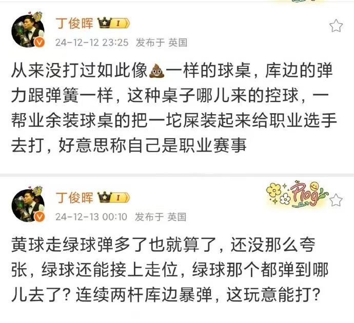 2024年苏格兰公开赛期间,丁俊晖以3-4负于卢卡-布雷塞尔后,在社交媒体平台上发表了批评比赛球台的言论。