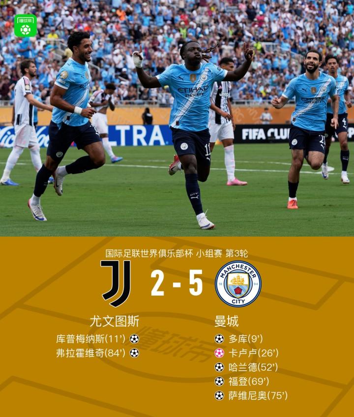 国际足联世界俱乐部杯小组赛第3轮,尤文图斯对阵曼城。上半场,努里秒传,多库破门。埃德森送礼,库普梅纳斯扳平比分。随后,努内斯传球,卡卢卢自摆乌龙。下半场,哈兰德和福登相继破门锁定胜局。萨维尼奥轰入世界波,而尤文则由弗拉霍维奇扳回一城。全场比赛结束,曼城5-2战胜尤文,以小组第1的成绩出线。