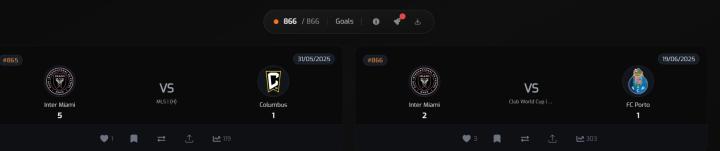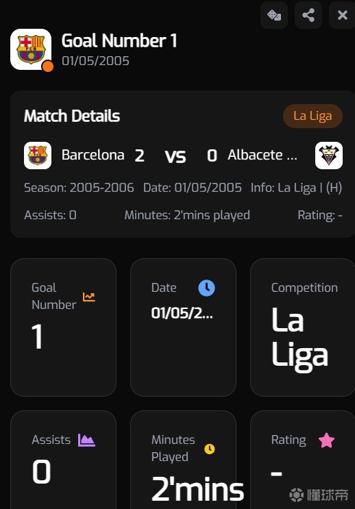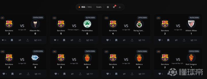 这个网站详细收录了从梅西职业生涯打进的首粒进球(2005年5月1日代表巴塞罗那对阵阿尔瓦塞特时打进),到现在为止的第866粒进球(2025年6月19日代表迈阿密国际对阵波尔图时打进)的所有进球数据。