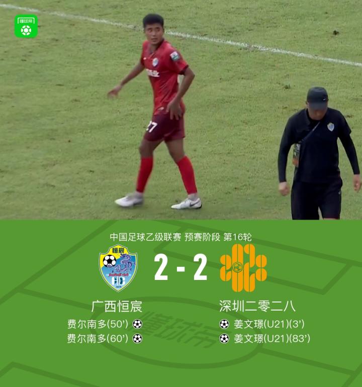 深圳二零二八客场2-2广西恒宸遭二连平,费尔南多、姜文璟双响