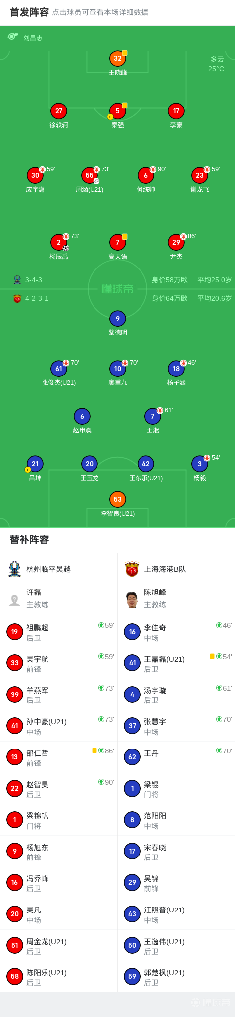 北京时间6月27日中国足球乙级联赛 预赛阶段 第16轮,杭州临平吴越主场对阵上海海港B队。上半场,廖重九远射造险;下半场,杨辰禹破门制胜。最终比分杭州临平吴越1-0上海海港B队。