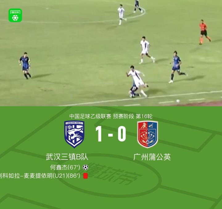 北京时间6月27日中国足球乙级联赛 预赛阶段 第16轮,武汉三镇B队主场对阵广州蒲公英。武汉三镇B队何鑫杰破门。最终比分武汉三镇B队 1-0 广州蒲公英。
