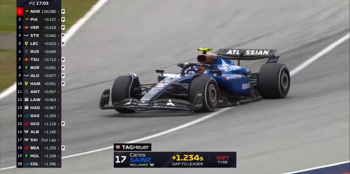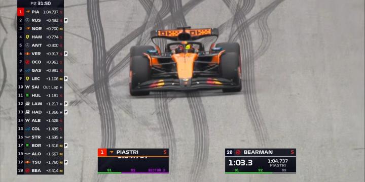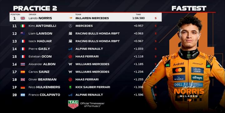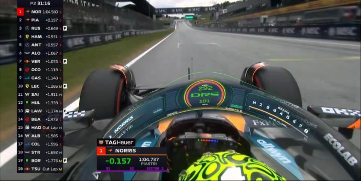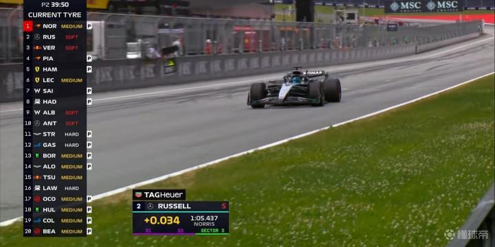 二练时间即将过半,皮亚斯特里大幅提高标杆成绩,快第2名的拉塞尔接近半秒;