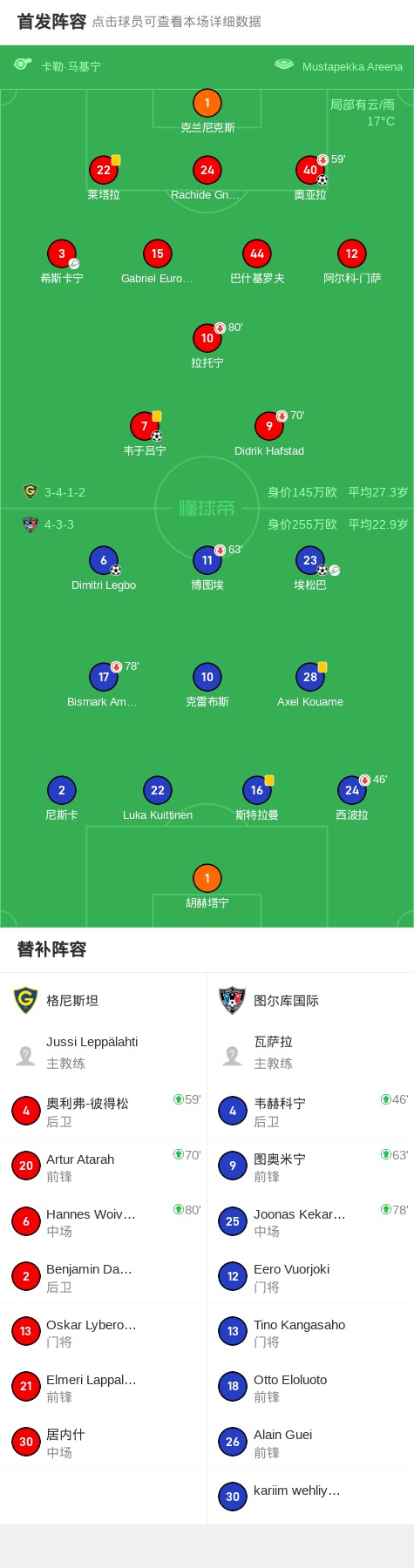 第45分钟,图尔库国际球员埃松巴助攻Dimitri Legbo打入一球。