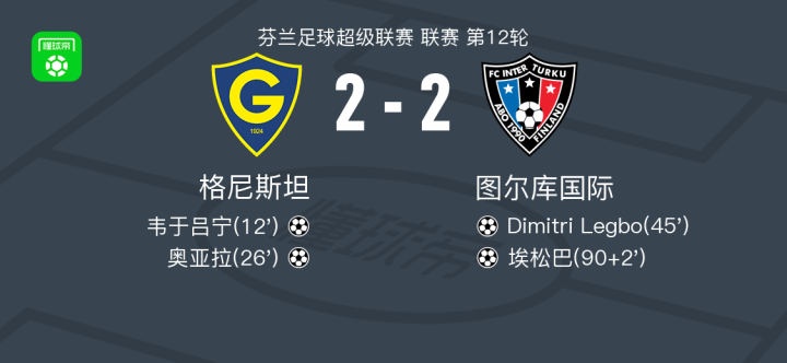 北京时间6月27日,芬兰足球超级联赛第12轮,格尼斯坦主场迎战图尔库国际。比赛中,格尼斯坦的韦于吕宁在队友希斯卡宁的助攻下率先破门,随后奥亚拉再下一城,帮助球队建立两球优势。易边再战,图尔库国际由埃松巴助攻Dimitri Legbo扳回一球,比赛进入下半场补时阶段,埃松巴再进一球,将比分最终定格为2比2。双方各取一分结束本场比赛。