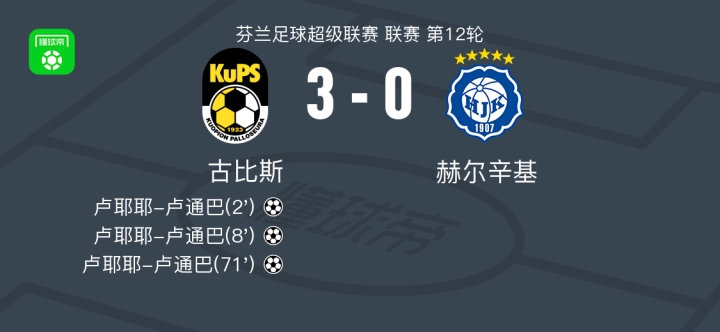 北京时间6月28日,芬兰足球超级联赛第12轮,古比斯坐镇主场迎战赫尔辛基。比赛中,古比斯球员卢耶耶-卢通巴表现出色,上演帽子戏法,帮助球队锁定胜局。最终,古比斯以3-0战胜赫尔辛基。