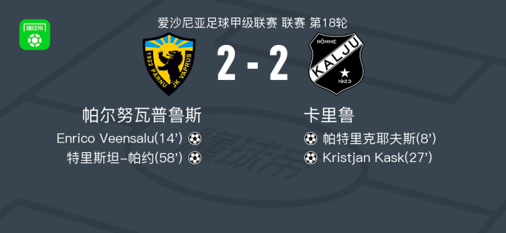 第27分钟,卡里鲁球员塔拉先科夫助攻Kristjan Kask打入一球。