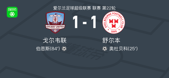 北京时间6月28日,爱尔兰足球超级联赛第22轮,戈尔韦联坐镇主场迎战舒尔本。比赛中,舒尔本球员奥杜贝科接队友兰尼助攻完成破门。戈尔韦联方面,伯恩斯在比赛后期攻入一球。最终双方以1比1握手言和。