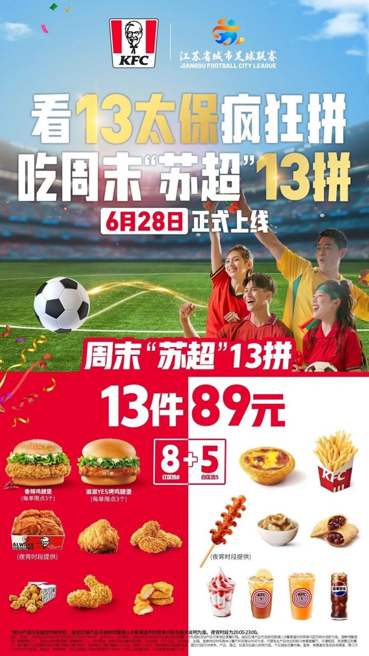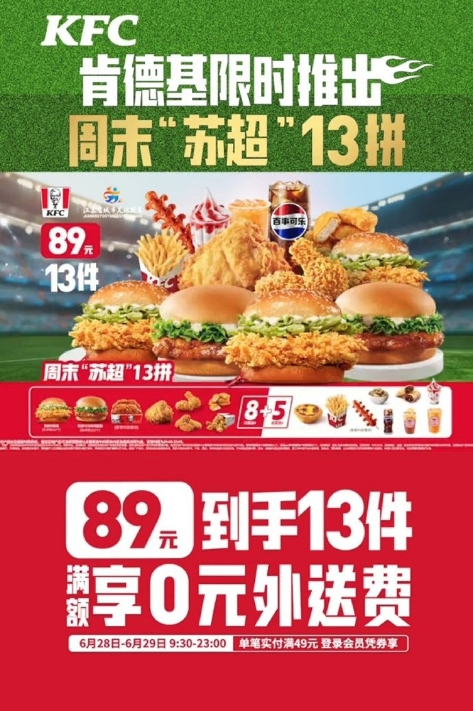 北京时间6月28日,苏超迎来又一个比赛日,肯德基限时推出周末“苏超”13拼活动。