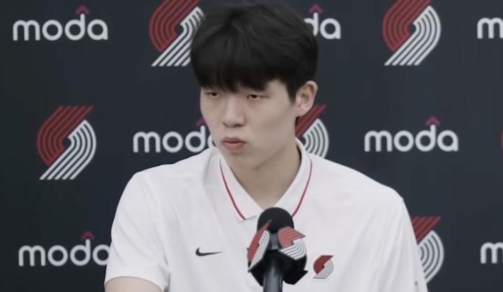 杨瀚森在开拓者亮相之后,出席了新闻发布会。