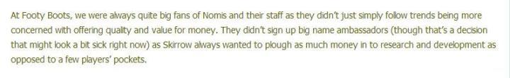 最后引用Footy Boots网站的一段话,来表示对nomis的敬意。我们一直是Nomis以其员工的支持者,因为他们不是简单的追逐潮流,而是考虑如何提供高质量给消费者,让他们觉得物有所值。他们从没请大牌球星代言(尽管现在看来这或许是导致他们陷入困境的一个决定),因为Skirrow总是把尽可能多的资金投入到研发中去,而不是去装满某个球星的口袋。