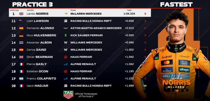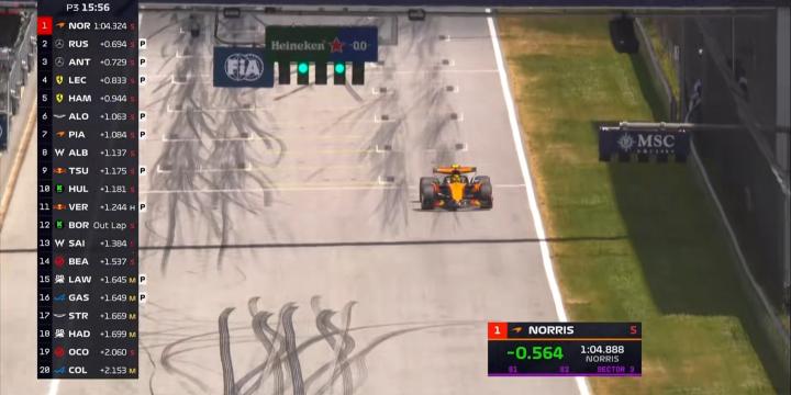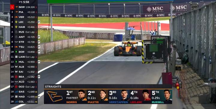 三练进行至45分钟,诺里斯大幅提高自己的标杆成绩,三段刷紫领先第2名的拉塞尔0.694秒;
