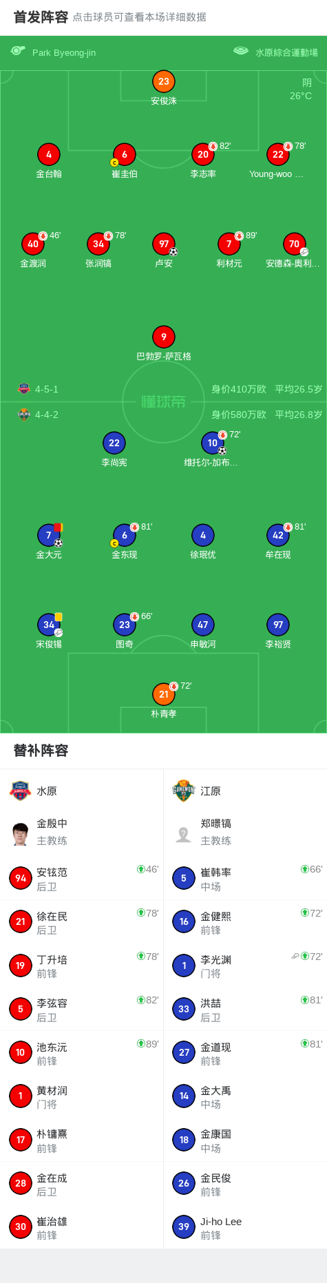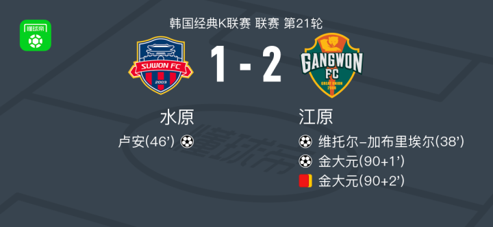 北京时间6月28日韩国K联赛第21轮,水原主场迎战江原。比赛第38分钟,宋俊锡送出助攻,维托尔-加布里埃尔为江原首开纪录。第46分钟,安德森-奥利韦拉送出妙传,卢安破门帮助水原扳平比分。下半场补时阶段,李光渊助攻金大元破门,帮助江原再度领先。随后不久,金大元因累计两张黄牌被红牌罚下。最终全场比赛结束,水原FC 1-2 江原。