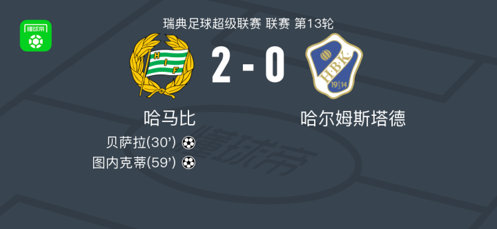 6月28日瑞典足球超级联赛第13轮,哈马比坐镇主场迎战哈尔姆斯塔德。比赛中,贝萨拉接图内克蒂助攻率先破门,随后图内克蒂再下一城,帮助球队扩大领先优势。最终,哈马比以2-0战胜对手,全取三分。
