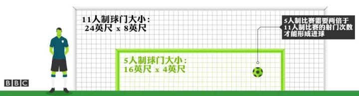 五人制比赛的球门尺寸为16英尺×4英尺,十一人制比赛的球门尺寸为24英尺×8英尺。所以五人制比赛对射门精度的要求更高,形成进球所需的射门次数是十一人制的两倍。