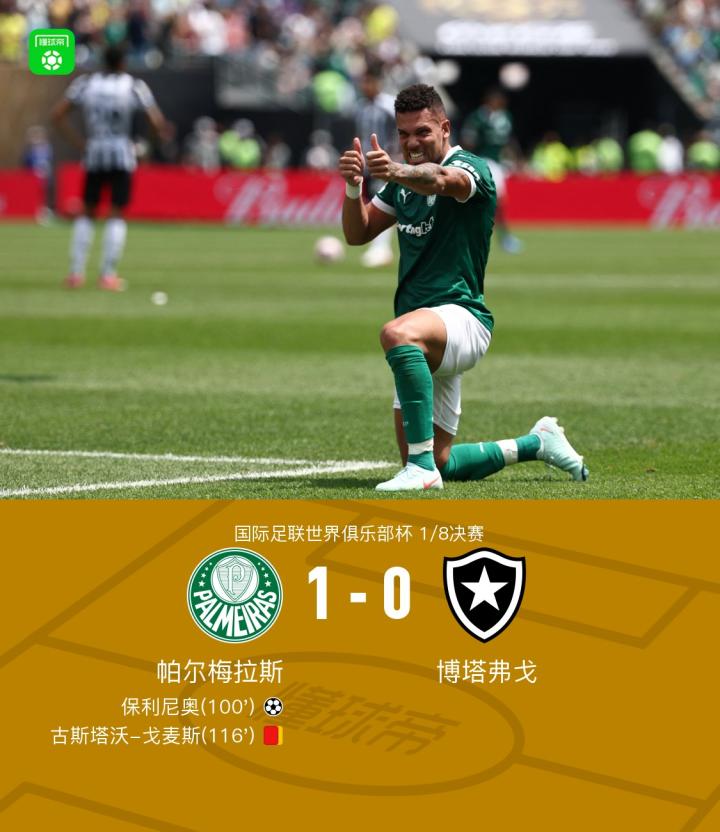 帕尔梅拉斯1-0博塔弗戈晋级八强,保利尼奥加时破门一锤定音