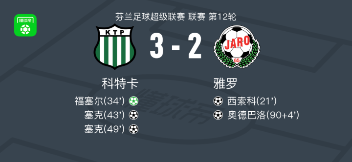 北京时间6月29日,芬兰足球超级联赛第12轮,科特卡坐镇主场迎战雅罗。比赛第21分钟,雅罗球员Albin Björkskog送出助攻,西索科为客队首开纪录。第34分钟,科特卡球员福塞尔主罚点球命中,帮助球队扳平比分。第43分钟,福塞尔再次建功,送出精准传球助攻塞克破门,科特卡实现反超。易边再战,第49分钟,科特卡球员Constantine Edlund助攻塞克再入一球,将比分扩大为3-1。比赛进入下半场补时阶段,雅罗球员Jim Myrevik助攻奥德巴洛破门,为主队追回一球。最终全场比赛结束,科特卡以3-2战胜雅罗。
