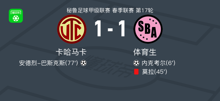 北京时间6月29日,秘鲁足球甲级联赛春季联赛第17轮,卡哈马卡主场迎战体育生。比赛第6分钟,体育生球员卡洛斯-洛佩斯送出助攻,内克考尔为球队首开纪录。上半场补时阶段,莫拉因犯规动作过大被裁判直接出示红牌罚下,体育生在人数上陷入劣势。比赛第77分钟,卡哈马卡球员克里斯蒂安-梅希亚送出精准传球,安德烈-巴斯克斯抓住机会破门得分,帮助球队扳平比分。最终全场比赛结束,卡哈马卡以1比1战平体育生。