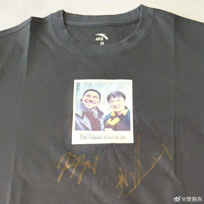 6月29日,樊振东更新微博,晒出印有两人合影的T恤,图片是两个人一起去多特蒙德看球赛的合影,祝福德国名将波尔退役后的生活顺利。