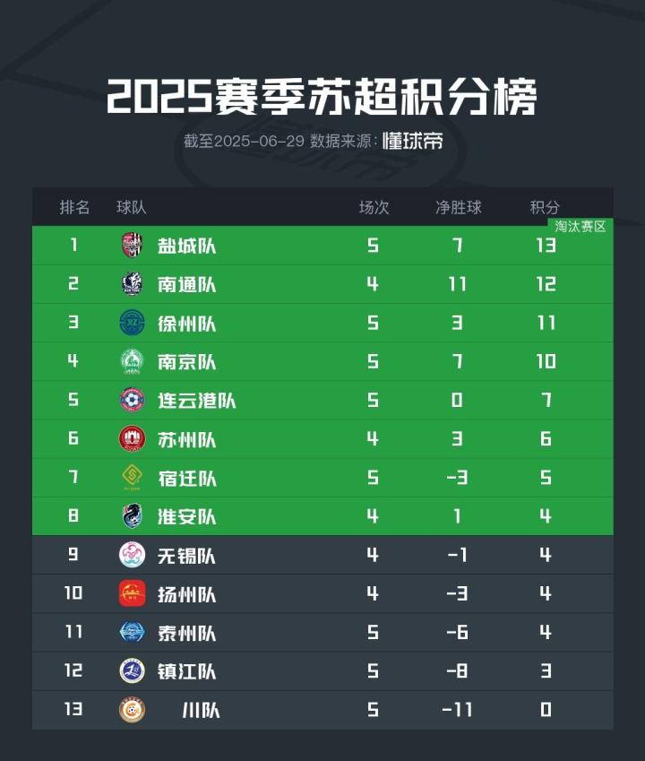 北京时间6月29日,苏超第5轮的比赛全部结束。盐城队4连胜积13分领跑,南通队4战全胜少赛一场积12分排第二,“川队”5连败0进球继续垫底。