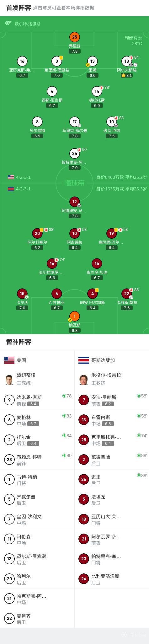 第47分钟,蒂尔曼助攻,阿尔夫斯滕破门,美国2-1哥斯达黎加