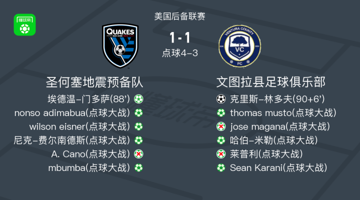 点球大战圣何塞地震预备队5-4文图拉县足球俱乐部,莱普利失点
