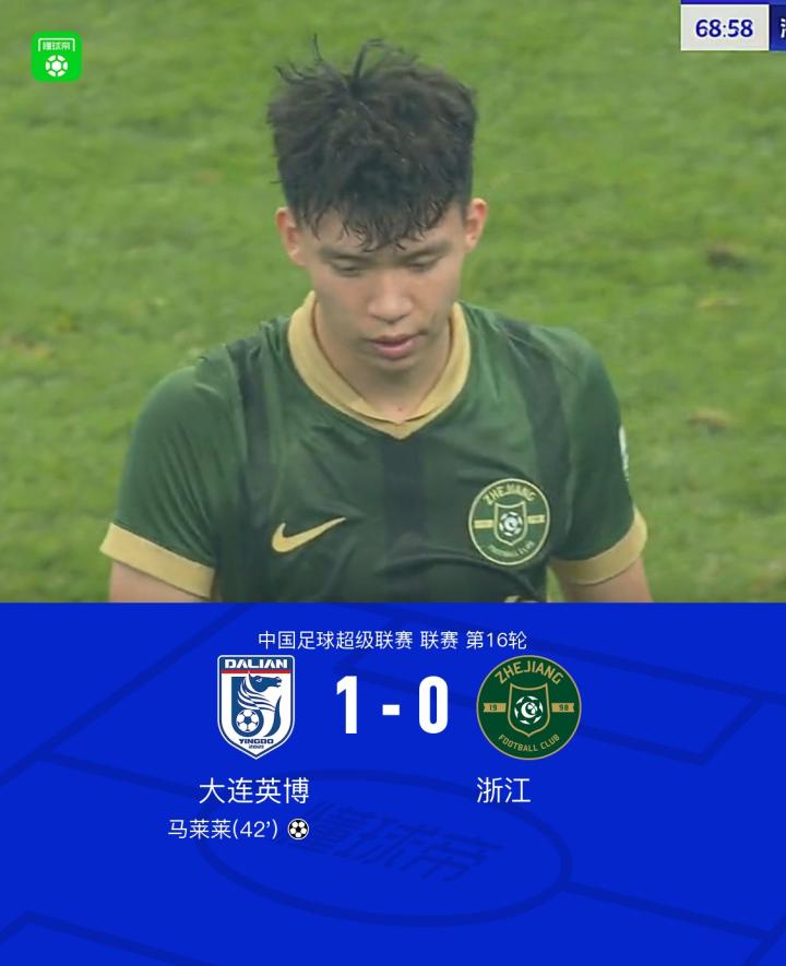 北京时间6月30日中国足球超级联赛第16轮,大连英博主场对阵浙江。大连英博马莱莱破门。最终比分大连英博1-0浙江。