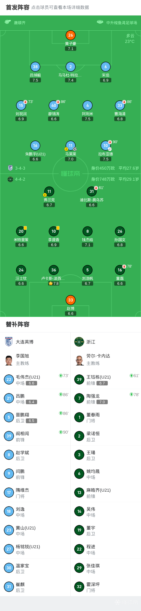 大连英博1-0浙江,马莱莱制胜,陶强龙、弗兰克造险