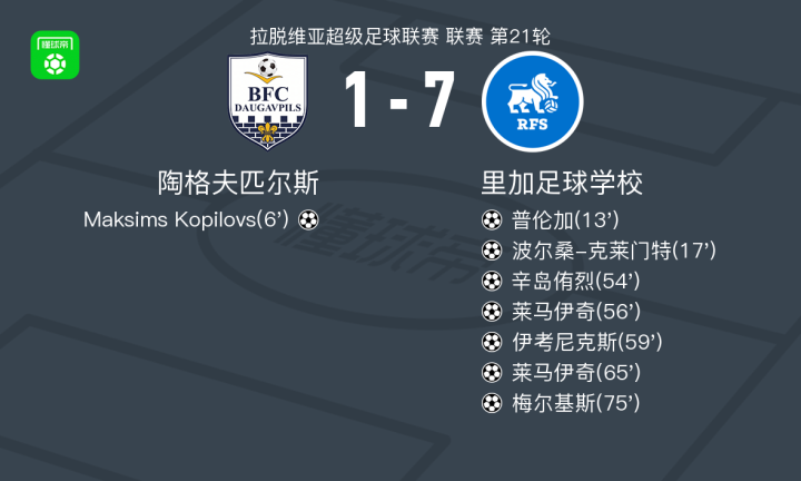 北京时间6月30日,拉脱维亚超级足球联赛第21轮,陶格夫匹尔斯主场迎战里加足球学校。比赛过程中,陶格夫匹尔斯由Maksims Kopilovs打入一球。里加足球学校则多点开花,普伦加、波尔桑-克莱门特、辛岛侑烈、莱马伊奇、伊考尼克斯和梅尔基斯均有进球入账。其中莱马伊奇完成梅开二度。最终比分陶格夫匹尔斯 1-7 里加足球学校。