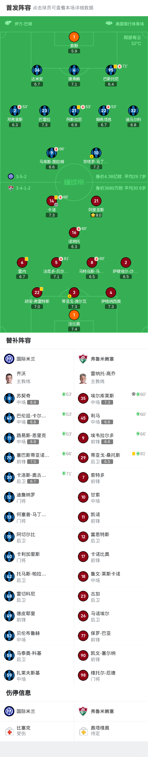 7月1日,国际足联世界俱乐部杯1/8决赛展开一场较量,国际米兰迎战弗鲁米嫩塞。上半场,卡诺闪击得分。下半场,劳塔罗射门中框弹出,德弗赖门前失良机。随后,埃尔库莱斯低射破门杀死比赛。补时阶段,迪马尔科搓射也是中框弹出。全场比赛结束,国米0-2不敌弗鲁米嫩塞,无缘世俱杯8强。