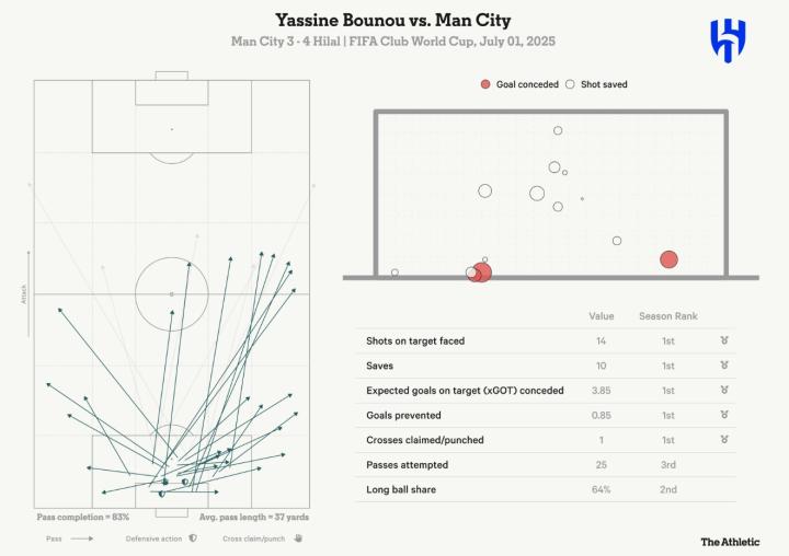 布努对阵曼城比赛数据图,面对14次射正扑出10次
